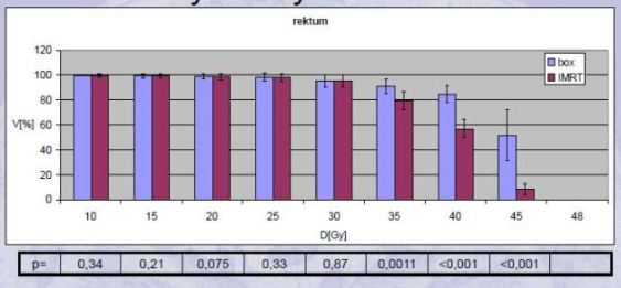 - Roeske 2000: redukce průměrné dávky na střevo o 50%, na rektum o 25%