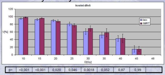- Dozimetricky nižší objemy kostní dřeně ozářené dávkou >20Gy – pouze při cíleném šetření KD, klinický význam?!?