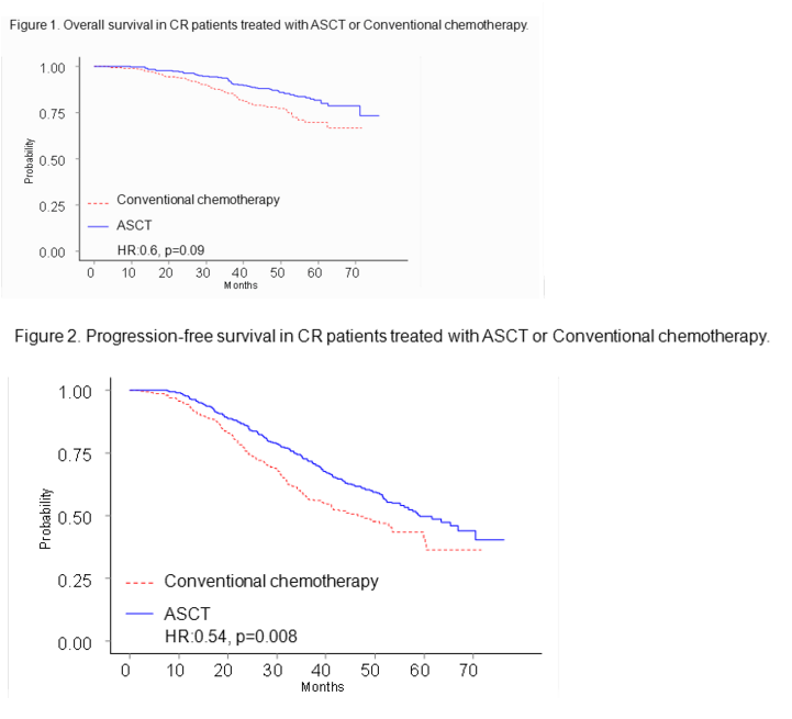 In the multivariate analysis, ASCT confirmed to be an independent predictor of prolonged PFS in CR patients, with a trend towards longer OS, in comparison with CC.