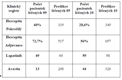 Tab. 1 Porovnání počtu léčených a predikovaných pacientek v roce 2009 a 2010 biologickou léčbou karcinomu prsu
