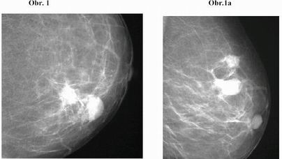 1. Pacientka A.P., 62 let.Mammografický obraz doložen na