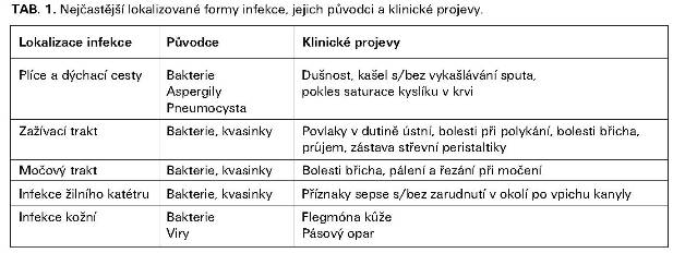 Nejčastější lokalizované formy infekce u onkologických nemocných ukazuje tabulka č.1. Mezi nimi je nejvíce frekventní pneumonie s výskytem cca 15-30% dokumentovaných infekcí.