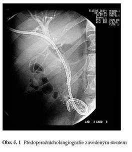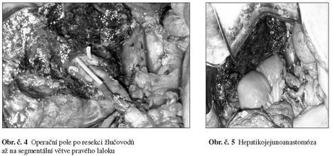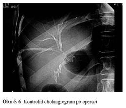 Založena hepatikojejunastomóza na segmentální žlučovody pravého jaterního laloku. Kontrolní cholangiografie po operaci zobrazuje patentní biliodigestivní anastomózu.