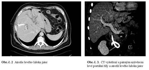 Nález byl chirurgem na jiném pracovišti vyhodnocen jako inoperabilní, z provedené peroperační biopsie nebyl histologicky karcinom potvrzen, přesto byla provedena brachyterapie cestou PTD, při které byla rovněž zavedena trvalá zevní drenáž jater. Na CT vyšetření je zřejmá atrofie levého laloku jater v důsledku postižení a uzávěru levé portální žíly. Obr. č. 2,3.