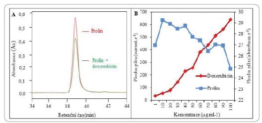 Koncentrace aminokyselin (glycin, prolin, sarkosin, cystein, tyrosin, lysin, taurin, ß alanin) zůstávala během analýzy 100 µg/ml. Byly pozorovány změny ploch píků aminokyselin a následně procentuálně vyjádřeny. Nejvyšší interakce byla zjištěna u prolinu, jehož pík oproti kontrolnímu vzorku vykazoval nejvýraznější zmenšení plochy, a to o 18,6 %. V případě taurinu, kde byla zjištěna druhá nejvýraznější interakce došlo ke zmenšení plochy píku o 13,8 %. U cysteinu a lysinu byly zaznamenány změny podstatně méně výrazné, a to u lysinu o 0,6 % a u cysteinu o 0,4 %. U zbylých aminokyselin tyrosinu, glycinu, sarkosinu a ß alaninu nebyly zaznamenány změny téměř žádné. Procentuálně rozdíl ploch píku nedosahoval ani jednom případě více než 0,05 %. Vysoká míra interakce naznačuje tvorbu komplexu doxorubicinu s danými aminokyselinami.