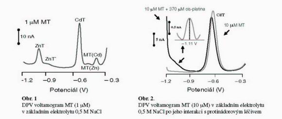Námi navržený postup pro studium interakce MT s těžkými kovy byl využit pro stanovení koncentrace protirakovinového léčiva cis-platiny [PtII (NH3)2Cl2]0; Mw 303. Na obrázku 2 je ukázán voltamogram cis-platiny po jeho interakci s MT modifikovanou HMDE. Na záznamu se objevuje signál při potenciálu -1,1 V, který pravděpodobně odpovídá vzniklému komplexu cisplatiny s MT. Byla studována závislost na na době interakce cis-platiny s modifikovanou HMDE. Získaná závislost PtMT komplexu s rostoucí dobou interakce rostla. Závislost na koncentraci byla v mtestovaném rozsahu (1mM – 100 µM) lineární.