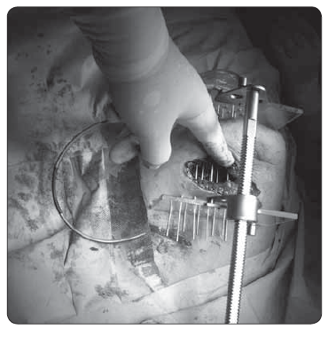 Perioperační MIB pro APBI se ve FN Hradec Králové používá od roku 2012 pro selektované pacientky s velmi časným karcinomem prsu (věk > 60 let, pT1pN0, G1–3, L0, V0, HER2 neg). U těchto pacientek jsou peroperačně po tumorektomii se zavedením chirurgických klipů a biopsii sentinelové uzliny aplikovány pomocí dutých ocelových jehel intersticiální katetry (obr. 1). Následná APBI se zahajuje obvykle sedmý den po operaci. Po zakreslení lůžka tumoru do plánovacího CT s respektováním pozice chirurgických klipů, mamografického nálezu a lokalizace jizvy je definován klinický cílový objem (CTV) tak, aby byl zajištěn bezpečnostní okraj 20 mm ve všech směrech. Předepsaná dávka je 34 Gy v 10 frakcích aplikovaných dvakrát denně. U všech pacientek je nasazena adjuvantní hormonální léčba.