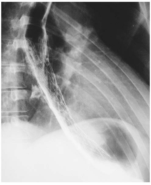 Implantovaný kovový stent při karcinomu distálního jícnu.