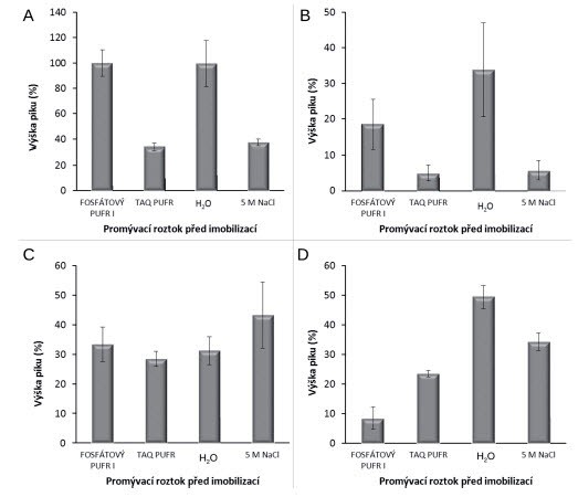 Pro zajištění nejvyšší výtěžnosti izolované DNA bylo optimalizováno použití promývacích roztoků (fosfátový pufr I, Taq pufr, H2O, 5 M NaCl) před imobilizací a po ní. Při promývacích krocích bylo nejvyšší účinnosti izolace dosaženo, pokud se částice promývaly po imobilizaci amplikonů pomocí 5 M roztoku NaCl a před imobilizací pomocí fosfátového pufru I (obr. 1A). Pro relativní srovnání promývacích roztoků byla tato maximální hodnota výtěžnosti brána jako 100 %. Při použití fosfátového pufru I a H2O před imobilizací byla účinnost purifikace DNA obdobná, ale lepší opakovatelnosti měření bylo dosaženo u fosfátového pufru, kdy byla směrodatná odchylka stanovení (RSD) pro 5 měření 10,4 %. Při použití H2O byla RSD 18,1 %. Opakovatelnost byla dále zlepšena při promytí částic před imobilizací Taq pufrem (RSD 2,7 %) nebo 5 M roztoku NaCl (RSD 2,6 %), ale výtěžek izolace byl za těchto podmínek nižší než v předchozím případě (34-37 %). Nejlepší opakovatelnosti měření bylo dosaženo při promytí částic před imobilizací Taq pufrem a po imobilizaci fosfátovým pufrem I (RSD 1,2 %, obr. 1D), ale výtěžek izolace byl za těchto podmínek nízký (23,5 %). Naopak nejhorší opakovatelnosti měření (RSD 18,1 %) bylo dosaženo promytím částic před imobilizací pomocí H2O a po imobilizaci pomocí 5 M roztoku NaCl.