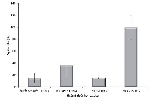 Zvýšení účinnosti izolace DNA bylo také dosaženo optimalizací složení elučního roztoku, kdy byly porovnávány roztoky fosfátového pufru II a Tris-EDTA o pH 6,5 a Tris-HCl a Tris-EDTA o pH 9. Z výsledků je zřejmé, že vyšší účinnosti izolace bylo dosahováno při použití roztoku Tris-EDTA (obr. 2) ve srovnání s ostatními roztoky. Relativní maximální hodnota výtěžnosti (100 %) byla stanovena u roztoku Tris-EDTA o pH 9. U stejného roztoku o pH 6,5 byla výtěžnost 36,9 %. Vliv pH na izolaci DNA byl dále ověřen. Nejlepší opakovatelnost je při použití roztoku Tris-HCl (RSD 1,4 %) v porovnání s Tris-EDTA o pH 9 (RSD 20,5 %), ale výtěžnost je nízká (15,2 %).