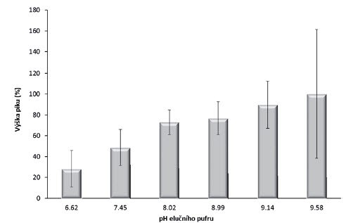 Dále bylo optimalizováno pH elučního roztoku Tris-EDTA. Z výsledků je zřejmé (obr. 3), že se zvyšujícím se pH bylo dosaženo vyšší výtěžnosti izolace. Nejvyšší relativní účinnost izolace (100 %) byla zjištěna u hodnoty pH 9,6, ale při vyšších hodnotách pH došlo k výraznému zhoršení opakovatelnosti měření (RSD 61,4 %). Obdobně při použití roztoku o příliš nízkém pH byla také opakovatelnost zhoršena. Optimální tedy bylo použití roztoku o pH 9, kdy bylo dosaženo dobré výtěžnosti izolace (78 %) i opakovatelnosti měření (RSD 15,8 %), ačkoliv nejlepší opakovatelnosti měření (RSD 11,8 %) bylo dosaženo při použití elučního roztoku o pH 8, ale výtěžek izolace byl nízký (76,9 %).