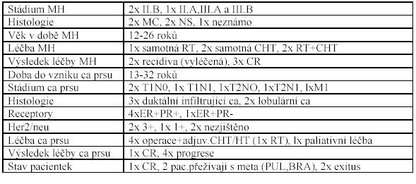 V letech 1969-1985 jsme na našem pracovišti léčili a později sledovali 5 žen s diagnózou sekundárního ca prsu po léčbě MH. Ve 2 případech šlo o dívky, které se s MH léčily a později byly sledovány na jiném pracovišti. Souhrn údajů o nemocných udává tabulka: