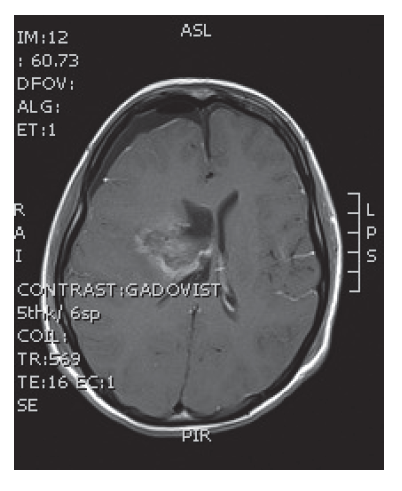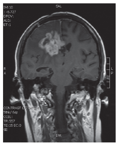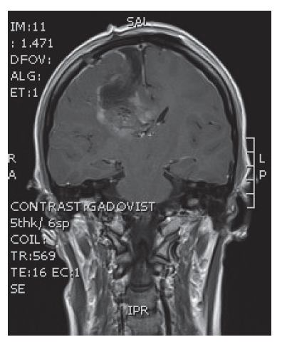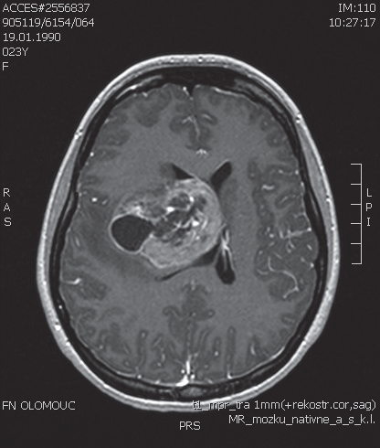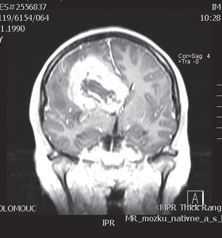 V naší kazuistice prezentujeme 25letou pacientku s negativní onkologickou rodinnou anamnézou, která dosud vážněji nestonala. Udávala asi 3 měsíce progredující bolesti hlavy a krční páteře, zvracení, postupně rozmazané vidění a parestezie horních končetin. Byla provedena magnetická rezonance, na které diagnostikován tumor mozku ve frontálním laloku vpravo, vyplňující frontální roh postranní komory velikosti 6x5 cm, midline shift, mass efekt. Dne 23. 9. 2013 ji byla na neurochirurgické klinice provedena neradikální exstirpace tumoru z parasagitální kraniotomie. Histologicky byl prokázán glioblastom multiforme gr. IV. Od 30. 10. 2013 do 12. 12. 2013 absolvovala konkomitantní radiochemoterapii (radioterapie do CLD 60,0 Gy) s temozolomidem (75 mg/m2 per os D1-42). Od ledna do dubna 2014 pokračovala v chemoterapii temozolomid solo v dávce 150 mg/m2, resp. od 2. cyklu 200 mg/m2 D1-5 ( Temodal tbl, celkem 4x). Na kontrolní MRI mozku ze dne 20. 5. 2014 byla prokázána progrese rezidua. Dne 4. 6. 2014 podstoupila druhou operaci, histologicky verifikován glioblastom multiforme s přechodem v gliosarkom. Snažili jsme se získat informace ze zahraniční literatury s léčbou gliosarkomu, bohužel se jedná o velmi vzácné onemocnění a údajů není mnoho. Nakonec byla zvolena léčba podle protokolu ICE (ifosfamid, carboplatina, etoposid), který je obdobou režimu PEI. Dávky: ifosfamid 1000 mg/m2 D1-3, carboplatina 110 mg/m2 D1 a etoposid 100 mg/m2 D1-3 v pětitýdenním cyklu. Pacientka zahájila 1. sérii od 1.7.2014 s podporou G-CSF (Neulasta s.c.). Léčbu tolerovala dobře, bez akutních či pozdních vedlejších nežádoucích účinků a významné hematologické toxicity. Po 3 cyklech podstoupila kontrolní MRI, kde popsána parciální regrese periferního sycení – rezidua tumoru. Po dalších 3 cyklech chemoterapie provedena restagingová MRI, kde popsána opět mírná regrese rezidua tumoru. Celkový stav pacientky se během léčby postupně zlepšoval, je mobilní, bez psychoorganického syndromu. Byly vysazeny kortikoidy, což vedlo k ústupu cushingoidního syndromu. Bylo rozhodnuto o pokračování v dalších 2 cyklech udržovací chemoterapie, na kontrolní MRI ze 14. 4. 2015 a 7. 7. 2015 popsána stabilizace onemocnění.