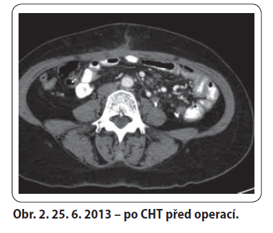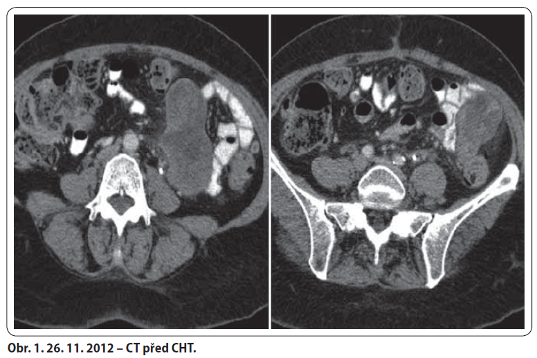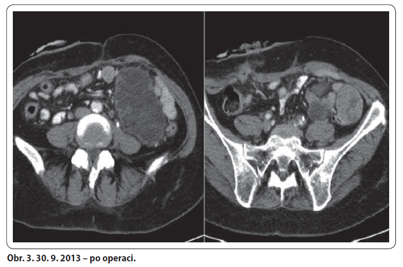 57letá žena, bez komorbidit a chronické medikace, došetřována od ledna 2012 pro chřipkové příznaky a váhový úbytek 10 kg. Proveden UZ břicha a gynekologické vyšetření s nálezem hypoechogenního útvaru v malé pánvi. Následně laparotomie s ovarektomií, kde v oblasti levé ovariální fosy tumor retroperitonea fi xující levý vaječník a vejcovod, potvrzeno i na CT. Histologicky dobře diferencovaný smíšený mezenchymální maligní tumor. 19. 7. 2012 v MOÚ Brno exstirpace nejasně ohraničeného tumoru (130 × 100 × 80 mm) spolu s hysterektomií. Histologicky high-grade polymorfocelulární sarkom bez bližší orgánové specifikace. Následně adjuvantní RT v KOC Zlín v dávce 46,8 Gy/ 26 fr. na malou pánev a 59,4 Gy/ 33 fr. na lůžko tumoru. Po ukončení RT pro bolesti zad provedeno CT. Na něm nově objemné expanzivní útvary mezi střevními kličkami a v levém mezogastriu – suspektní metastázy. V 1/ 2013 revize dutiny břišní v MOÚ Brno – nález inoperabilní, provedena paliativní spojková operace a vyvedena ileostomie. U pacientky s dobrým PS tedy indikována první linie paliativní CHT Adriamycin 3W. Od 2/ 2013 do 6/ 2013 bylo podáno celkem šest sérií se zajištěním filgrastimem pro neutropenie grade III. Dle CT přešetření bylo dosaženo parciální odpovědi. Z onkochirurgické komise KNTB pacientka indikována k operačnímu výkonu. 20. 8. 2013 byla provedena maximální debulking operace. Pooperačně CT i PET/ CT negativní. Poté podány tři série zajišťovací chemoterapie Adriamycin 3W s profylaktickým podáním filgrastimu. Kontrolní CT bez známek recidivy tumoru. V 3/ 2014 zanoření ileostomie. Dle CT restagingu z 5/ 2014 a 11/ 2014 trvá kompletní odpověď.