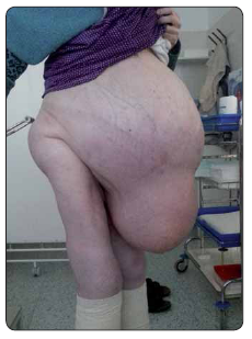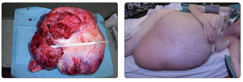 V kazuistice popisujeme případ smíšeného maligního mezenchymálního nádoru dělohy. 47letá pacientka byla referována do onkogynekologického centra ve Zlíně s monstrózním nádorem dutiny břišní. Histologie z biopsie: hladkosvalový nádor urogenitálního původu (leiomyom, leiomyosarkom?), biologické chování nelze z daného odběru stanovit. Vzhledem k velikosti nádoru, celkovému stavu pacientky, výrazné kachektizaci při tělesné váze 115 kg a minimální šanci delšího přežití bez operace bylo rozhodnuto, i přes vysoké operační riziko, o chirurgické léčbě. Dne 18. 12. 2013 byla provedena extirpace nádoru a satelitních metastáz. V rámci výkonu připojená abdominální hysterektomie s oboustrannou adnexektomií, resekce ilea s anastomózou „end to end“ a plastika břišní stěny. Operační výkon v délce 8,5 hodiny byl provázen velkou krevní ztrátou (aplikováno 24 EBR + 21 ČMP). V pooperačním období značná ztráta krve do drenů vyžaduje dne 19. 12. 2013 relaparotomii s aplikací Mikulitzovy tamponády a podání Novosevenu. Po její extrakci dne 20. 12. 2013 již bez známek většího krvácení, krevní ztráty kontinuálně hrazeny velkými krevními převody. Celkově za dobu hospitalizace aplikováno 56 EBR, 50 ČMP, 4 trombo-koncentráty. 30. 1. 2014 byla pacientka propuštěná do ambulantní péče s váhou 48 kg.