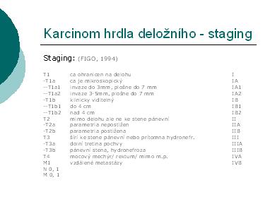 - MRI: velikost tumoru, stupeň invaze, rozsah nádoru, stav lymfatického aparátu (velikost LU: 0.5cm); Staging MRI/CT: rozsah: 90%/50% , parametria: 94/76%, LU:86/86%