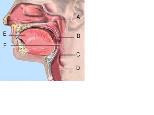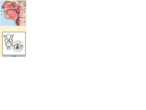 - přední patrový oblouk, měkké patro, epiglotis