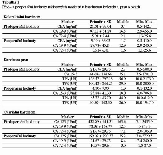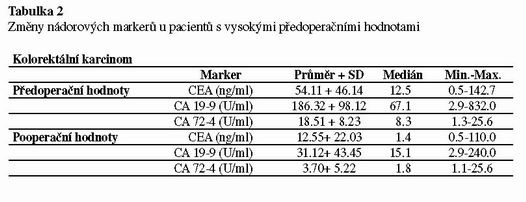 V tabulce 1 je vyhodnocení změn před– a pooperačních hodnot nádorových markerů u karcinomu kolorekta, prsu a ovaria. Z tabulky vyplývá, že po operaci dochází u všech tří lokalizací nádoru k poklesu hodnot nádorových markerů. Vzhledem k velkému rozptylu hodnot jsme se rozhodli v následujících tabulkách hodnotit pouze změny hladin nádorových markerů u nemocných, kteří měli předoperační hodnoty markerů vysoké. Při takto provedeném vyhodnocení byl rozdíl mezi před–a pooperačními hodnotami vysoce signifikantní (p<0.001), jak je ukázáno na příkladu kolorektálního karcinomu (viz tabulka 2). Senzitivita předoperačních hodnot výrazně stoupne, pokud je kalkulována pouze z hladin nádorových markerů, které byly před operací zvýšeny. Zde se senzitivita pro zhodnocení efektu operace blíží 90%.