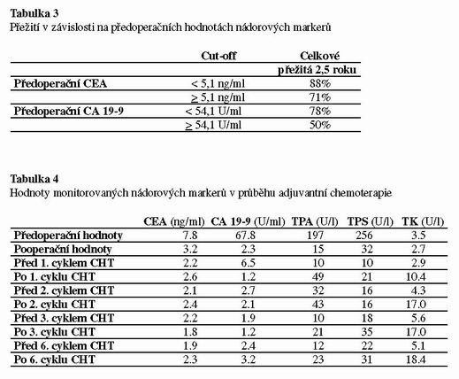 Z tabulky 3 vyplývá vztah mezi výší předoperačních hodnot CEA a CA 19-9 a dva a půl letým přežitím u karcinomu kolorekta. Je zřejmé, že doba přežití závisela na výši předoperačních hodnot. Výraznější rozdíly byly pozorovány u CA 19-9 než u CEA.