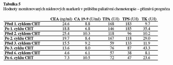 U adjuvantní léčby byla thymidinkináza jediným markerem, který vykazoval před– a po skončení cyklu chemoterapie signifikantní změny. Ostatní markery vykazovaly minimální variabilitu (viz. tabulka 4). Při paliativní léčbě změny nádorových markerů korelovaly s efektem léčby. Pokud byl efekt léčby příznivý, byly opět nejvýraznější změny u thymidinkinázy tak, jak tomu bylo u adjuvantní chemoterapie. Ostatní nádorové markery při úspěšné paliativní terapii pomalu klesaly (viz. tabulka 5). Signifikantní rozdíl byl prokazatelný mezi hodnotami před zahájením terapie a po posledním cyklu. Při nepříznivém průběhu paliativní terapie thymidinkináza postupně trvale stoupala. Hodnoty ostatních nádorových markerů zůstávaly vysoké a vykazovaly minimální variabilitu (viz tabulka 6).