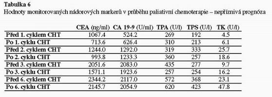 U 30 nemocných s kolorektálním karcinomem, podstoupily chemoterapii (15 adjuvantních a 15 paliativních) jsme monitorovaly nádorové markery CEA, CA 19-9, TPA, TPS a TK před a po skončení cyklu chemoterapie.
