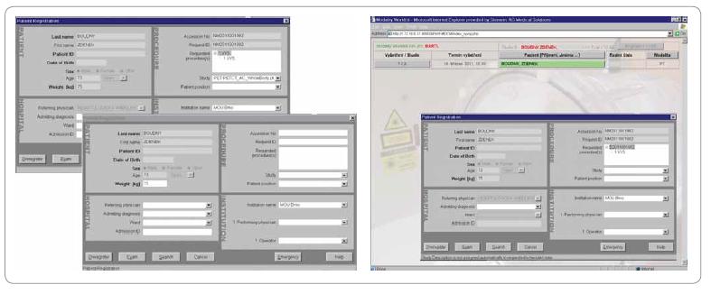 Správnost a úplnost ručně zpětně vloženého chybějícího jedinečného identifikátoru do přídavné studie (celotělové) na PT/CT akviziční stanici je velmi závislá na lidském faktoru. Řešením je přeposlat modifikovaný otevřený záznam z Dicom Modality WorkList (DMWL) serveru na plánovanou zobrazovací modalitu. Požadovaný modifikovaný záznam je generován pomocným DMWL serverem s jednoduchým grafickým rozhraním (GUI - obr. 2) pro velmi snadný a bezproblémový výběr pacienta pro přeplánování. GUI lze spustit v okně každého internetového prohlížeče na zobrazovací modalitě. Pokud se na akviziční stanici zobrazují při výběru (pře)plánovaných pacientů i dokončené studie, musí být pro jednoznačný výběr pacienta vždy zakázána lokální databáze (záložka registrace pacienta v konfiguračním panelu). U pacienta vybraného z dokončených studií dojde totiž ke ztrátě jedinečného identifikátoru přídavné studie.
