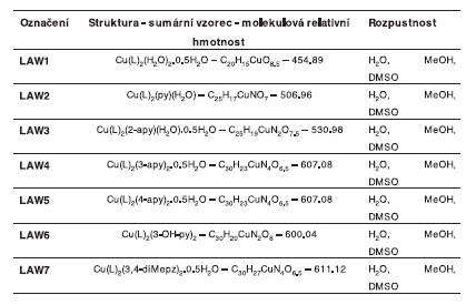 Pro syntézu komplexů byl použit lawson (Law, 2-hydroxy-1,4-naftochinon), octan měďnatý, resp. jeho monohydrate ((CH3COO)2Cu.H2O), a další chemikálie p. a. čistoty (Sigma-Aldrich, St. Louis, USA). Přehled použitých komplexů udává tab.1. Složení, čistota a stabilita použitých komplexů byla ověřena elementární analýzou a metodami spektrálními. Příprava těchto komplexů bude popsána v jiné publikaci.