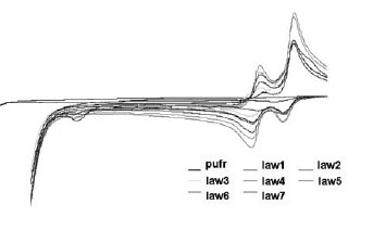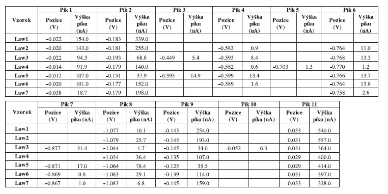 U všech testovaných komplexů byla v průběhu forvard scanu, stejně jako reverse scanu, patrná řada píků, které odpovídají oxidaci/redukci daného komplexu a jejichž počet i pozice se lišily v závislosti na struktuře komplexu. Největší počet píků vykazoval komplex Law3 (10, nejméně pak pro chemicky nejjednodušší komplex Law1, který představuje hydratovaný komplex lawsonu a měďnatých iontů bez přítomnosti dalšího ligandu. Porovnání voltamogramů jednotlivých komplexů za daných experimentálních podmínek je ukázáno na obr.1 Shrnutí charakterizace jednotlivých komplexů a jednotlivých píků (pozice, výška píku) uvádí tab. 2.