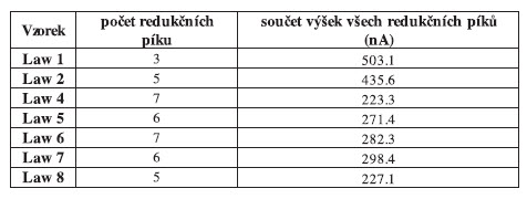 Pro vlastní schopnost generovat reaktivní formy kyslíku jsou důležité redukční vlastnosti komplexů, které jsou shrnuty v tabulce č. 3 jako počet redukčních píků a jejich součet. Podle součtu výšek jednotlivých redukčních píků je patrné, že nejvyšší redukční potenciál má vzorek s označením Law1. Při porovnání redukčních vlastností jednotlivých komplexů dostáváme následující řadu: Law1 > Law2 >> Law6 > Law5 > Law4 > Law7 > Law3.