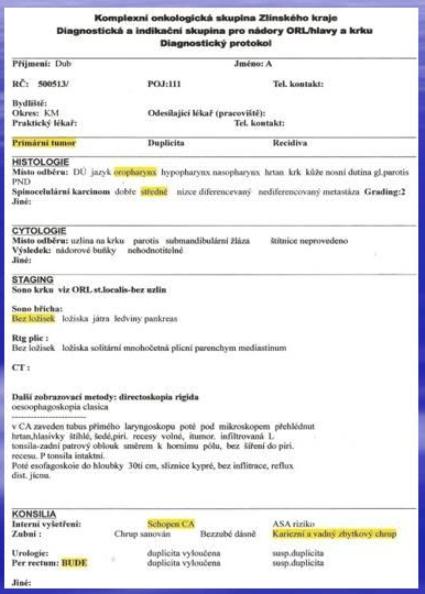 Na našem pracovišti funguje od prosince 2005 onkoORL komise Zlínského kraje, probíhá lx týdně přes internet a účastní se jí ORL odborníci ze Zlína, Kroměříže, Uherského Hradiště a Vsetína, dále klinický a radiační onkolog a radiodiagnostik. Pacienti jsou prezentováni pomocí speciálního standardizovaného protokolu a léčba je indikována dle standardů NCCN. Za 5 let fungování bylo projednáno 354 pacientů,z nichž 61 % mělo lokálně pokročilé onemocnění. 35 % pacientů bylo léčeno kombinovanou terapií.