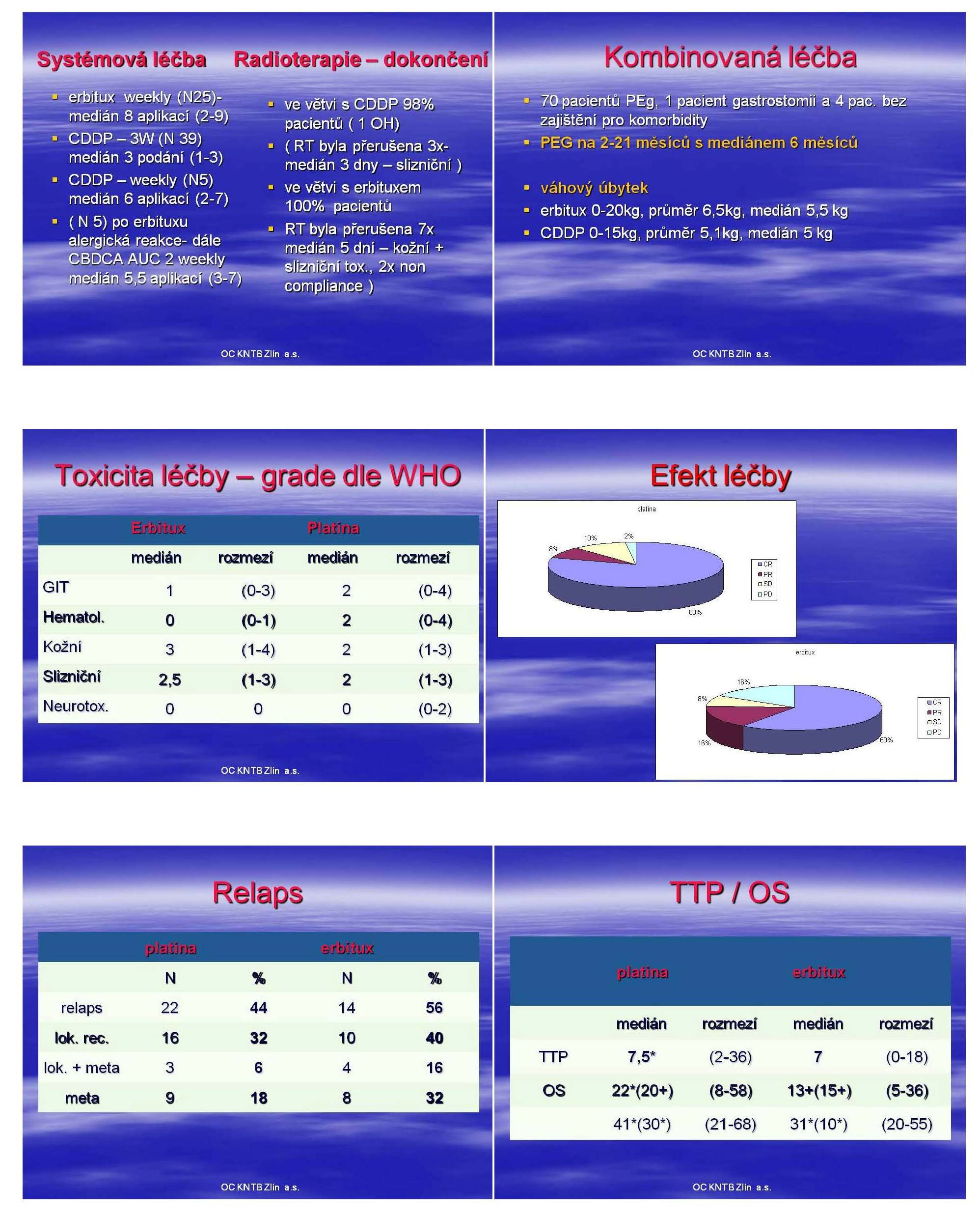 V našem vyhodnocení jsme se zaměřili na indikační kritéria pro použití erbituxu či platiny, dále na toxicitu a efekt jednotlivých režimů. Hodnotili jsme možnost snížení toxicity při pravidelné spolupráci s kožními lékaři, s nutriční ambulancí. Mimo 3 pacienty byli všichni zajištěni PEGem. Posuzovali jsme význam váhového úbytku na efekt či toxicitu terapie. U části pacientů jsme zpětně doplnili p16 a pokusili se vyhodnotit jeho dopad na výsledek léčby.