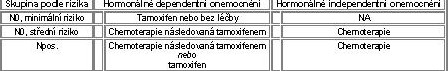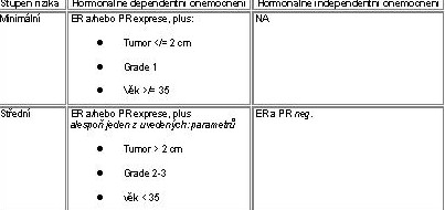 Definice a rozdělení do kategorií podle stupně rizika metastatické diseminace při negativním uzlinovém nálezu je v tabulce 1. V tabulce 2 jsou uvedena doporučení pro výběr adjuvantní léčby u postmenopausálních žen s karcinomem prsu.