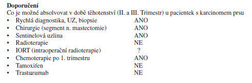 Léčba karcinomu prsu se nemusí kvůli těhotenství zdržet. Přerušení těhotenství není vždy nutné, nepřináší zlepšení výsledků léčby nádoru. Léčba probíhá podobně jako u netěhotných nemocných s ohledem na plod, který nesmí být poškozen. Pacientky s časným karcinomem prsu musí být léčeny s kurativním záměrem. Jako u žen, které nejsou těhotné je možné provádět operaci karcinomu prsu i u těhotných, neboť operace prsu i uzlin v podpaží představuje pro dítě minimální riziko. Nejobvyklejší metodou léčby pro pacientky s karcinomem prsu ve stádiu I, II eventuelně i III, které jsou těhotné je mastektomie s exenterací přilehlé axilly. Hlavním důvodem mastektomie je právě nemožnost ozařovat v době těhotenství. Po porodu je potom možné zvážit plastickou rekonstrukci prsu. Konzervativní chirurgický výkon na prsu v těhotenství je možný a bezpečný,ale představuje nebezpečí pro lokoregionální recidivy, proto musí být doplněn adjuvantní radioterapií po porodu. Neoadjuvantní chemoterapie může být zvažována před definitivní operací prsu u žen v pokročilém stádiu nemoci. V takových případech je operace provedena později nebo dokonce až po porodu. Většina žen se zhoubným nádorem prsu v těhotenství jsou kandidátky systémové léčby. Obecně dostávají těhotné ženy podobnou léčbu jako netěhotné ve stejné dávce na metr čtverečný tělesného povrchu. S narůstající hmotností nemocné je třeba dávku postupně upravovat. Expozice cytostatikům v prvním trimestru je kritická, období organogeneze představuje největší riziko. Naopak informace o frekvenci kongenitálních malformací po chemoterapii v druhém a třetím trimestru těhotenství jsou celkem příznivé. Ale přesto je aplikace cytostatik v druhém a třetím trimestru těhotenství spojená s nízkou porodní váhou, poruchou růstu nebo předčasným porodem asi u poloviny novorozenců. Přidání trastuzumabu k chemoterapii může způsobit oligohydroamnion a fatální renální selhání plodu, jak dokumentují literární údaje. Užívání selektivních modulátorů estrogenního receptoru jako je tamoxifen je v těhotenství zcela nevhodné, protože hrozí nebezpečí vaginálního krvácení, spontánního porodu, prodních komplikací i úmrtí plodu.