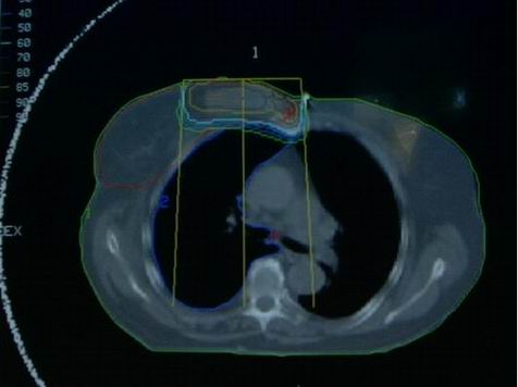 Standard: ozáření celého prsu po parciální mastektomii v dávce 50 Gy za 5 týdnů (2,0 Gy na frakci) s nebo bez ozáření regionálních lymfatických uzlin (obr. 3).