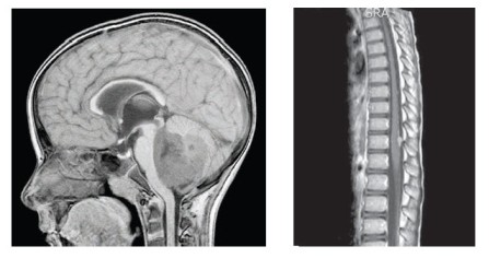 5-letý chlapec s negativní rodinnou anamnézou bez předchozích závažných morbidit se prezentoval příznaky intrakraniální hypertenze, poruchami zrakové ostrosti a nejistou chůzí. MRI mozku prokázala expanzivně se chovající nehomogenní tumor mozečku s nehomogenním sycením po kontrastu a s „polevovými“ míšnímu metastázami, tj. M3 nemoc, vysoké riziko (obr. 1,2). Pacient absolvoval totální exstirpaci primárního tumoru, histologicky byla potvrzena diagnóza meduloblastomu, desmoplastická varianta, bez amplifikace MYCC, MYCN (FISH vyšetření). Morfologický obraz tvořily uzly s buňkami se světlými jádry a s tmavými denzními jádry, polymorfní, mitoticky aktivní. Imunohistochemicky byla prokázána pozitivita synaptophysinu, mitotický index dle Ki67 byl 50 % a více. Zahájena byla léčba pro meduloblastomy vysokého rizika dle modifikovaného protokolu SJMB96 založená na kombinaci konkomitantní chemoradioterapie (temozolomid) s ozářením celé osy, dosycením na metastázy a zadní jámu, následovaly 4 cykly submyeloablativní chemoterapie s podporou autologních periferních kmenových buněk. Vzhledem k vysokému riziku nepříznivého průběhu nemoci jsme léčbu posílili cyklicky intraventrikulárně podávaným etoposidem cestou portu (Ommaya rezervoár). Intenzivní část protokolu pacient ukončil v parciální remisi.