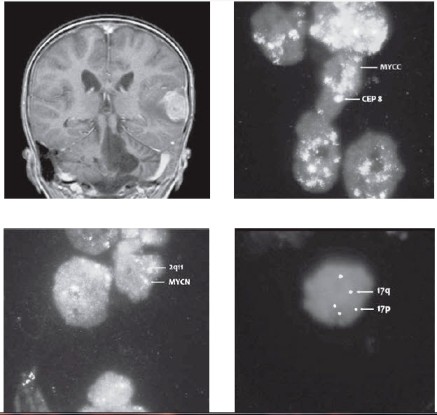 Nejčastější cytogenetickou odchylkou popisovanou u meduloblastomů jsou abnormity 17. chromosomu (7). Nález isochromozomu 17q (i17q) je spojen se ztrátou funkce tumor-supresorového genu p53 lokalizovaného na 17p. Může se vyskytovat u klasické varianty meduloblastomu a dále v asociaci s amplifikací MYCC a/nebo MYCN u anaplastického/velkobuněčného meduloblastomu (2, 7). Průkaz izo17q je spojen s nepříznivým průběhem onemocnění [7].