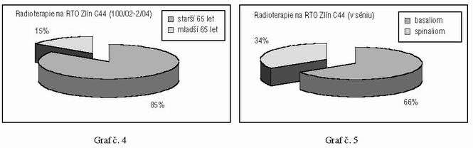 Na našem oddělení bylo od zahájení provozu RTG zářiče Gulmay 3225 – 10/02 ozářeno 44 kožních nádorů – z toho 69% bylo u osob straších 65 let viz gr. 4, v 66% (29) se jednalo o basaliom, 34% (15) spinaliom viz gr. 5. U 42 pacientů bylo dosaženo kompletní odpovědi (99,2%) u 2 pac. bylo dosaženo PR – RT nebyla donkčena RT pro interní komplikace.