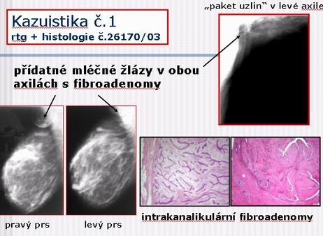 - odstraněny přídatné mléčné žlázy z obou axil – histologicky mléčné žlázy s fibroadenomy