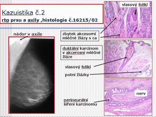 - histologie č. 16215/02 : karcinom v akcesorní prsní žláze pravé axily