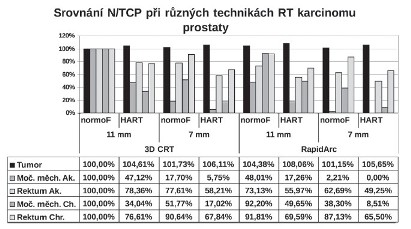 Získané hodnoty N/TCP byly normalizovány, 100 % odpovídá hodnotám plánu 3D CRT s lemem 11 mm při normofrakcionaci.