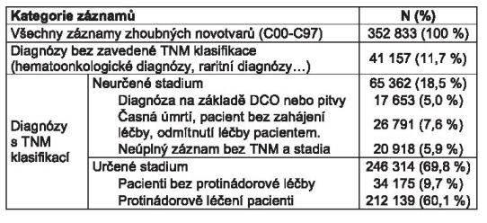 Z pohledu úplnosti údajů o klinickém stadiu onemocnění lze záznamy NOR rozdělit na dvě základní skupiny. První představují diagnózy, u kterých je zavedena TNM klasifikace a takové hodnocení je objektivně možné, druhou skupinu tvoří diagnózy bez TNM klasifikace nebo bez možnosti obdobné stratifikace dle údajů sledovaných v NOR. U diagnóz s platnou TNM klasifikací lze pak dále záznamy dělit dle úplnosti (viz tabulka 1).