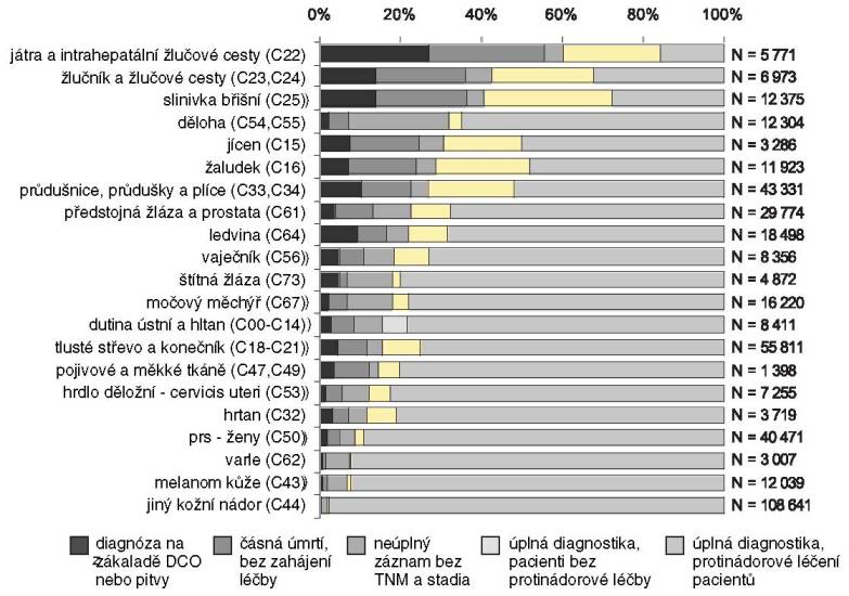 Z pohledu úplnosti údajů o morfologii novotvarů je nejvyšší podíl neurčených morfologií u diagnóz s vysokou mortalitou, obtížnou diagnostikou a u skupin pacientů s horší prognózou (pokročilá stadia). Mezi diagnózy s nejvyšším podílem záznamů s neurčenou morfologií patří ZN slinivky břišní, jater, žlučníku a žlučových cest, mozku a míchy a plic (tabulka 2).