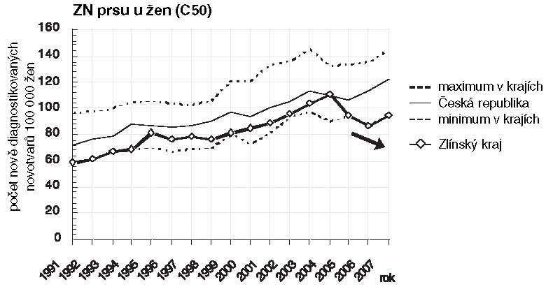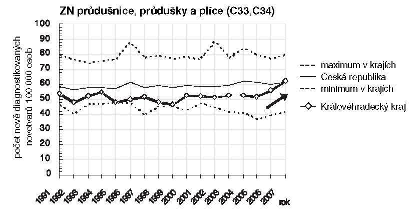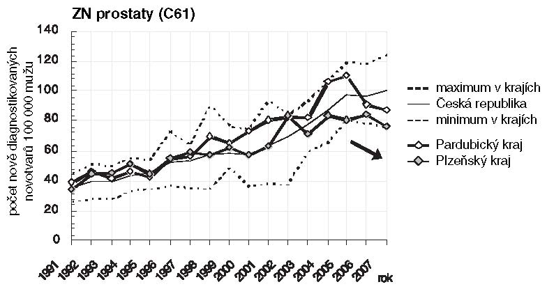 Dalším možným indikátorem kvality dat NOR je heterogenita v trendech incidence mezi regiony. Na úrovni krajů dochází samozřejmě i vzhledem k limitované velikosti sledovaných populací k náhodným fluktuacím, a to nejvýrazněji u méně četných diagnóz. V některých případech však lze pozorovat víceletý trend odlišující se od trendu v populaci celé České republiky. Statistická významnost takového rozdílu může indikovat systematické problémy s hlášením incidence v daném regionu. Pilotní analýzu jsme zaměřili na úhrnné trendy incidence všech zhoubných novotvarů a dále detailněji na analýzu čtyř nejvýznamnějších diagnóz v období 2004-2007. V případě trendů incidence všech zhoubných novotvarů a ZN tlustého střeva a konečníku nebyly zjištěny žádné výrazné regionální odlišnosti. U ZN plic byl zjištěn nadprůměrný rostoucí trend v Královéhradeckém kraji, u ZN prsu u žen pak obtížně vysvětlitelný pokles ve Zlínském kraji a u ZN prostaty obdobný pokles v krajích Pardubickém a Plzeňském (obrázek 2).