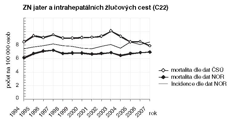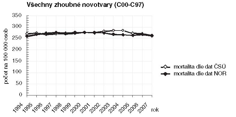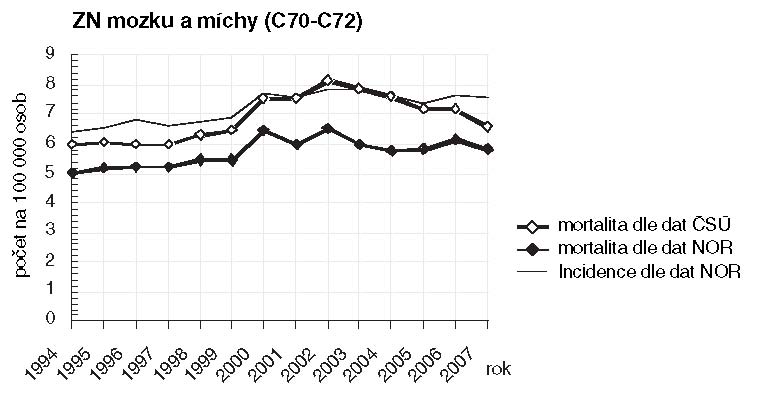 Mezi hodnotami specifické mortality nádorových onemocnění z populační databáze příčin úmrtí dle listu o prohlídce mrtvého (ČSÚ) a specifické mortality hodnocené z databáze NOR jsou u některých diagnóz významné rozdíly. V některých případech (ZN jater, ZN mozku a míchy) mortalita z dat ČSÚ převyšuje incidenci (obrázek 3). Tento jev indikuje příliš časté přiřazování příčiny úmrtí těmto diagnózám v populačních datech; NOR zde můžeme považovat za kontrolní databázi. Významné rozdíly v trendech mortality dle dat ČSÚ a NOR jsou pozorovány také v některých regionech. Tyto jevy naopak indikují možné problémy s kódováním příčin úmrtí.