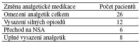 Benefit pro pacienty je především v redukci analgetické terapie. U 26 (81 %) nemocných došlo k změně medikace – 12 (37,5 %) z nich vysadilo silné opioidy a přešlo na slabší opioidy typu tramadolu nebo dihydrokodeinu. 6 (18 %) pacientů postupně užívalo pouze nesteroidní antiflogistika. Úplně léky proti bolesti vysadilo 8 (25 %) léčených. Celkově k omezení spotřeby analgetik o 50 % došlo u 12 (37,5 %) nemocných. Viz tabulka