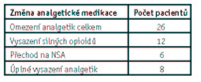 Benefit pro pacienty je především v redukci analgetické terapie. U 26 (81%) nemocných došlo k změně medikace - 12 (37,5%) z nich vysadilo silné opioidy a přešlo na slabší opioidy typu tramadolu nebo dihydrokodeinu. 6 (18%) pacientů postupně užívalo pouze nesteroidní antiflogistika. Úplně léky proti bolesti vysadilo 8 (25%) léčených. Celkově k omezení spotřeby analgetik o 50% došlo u 12 (37,5%) nemocných. Viz tabulka.