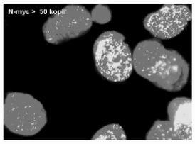 Biologickou povahu onemocnění se snaží popsat histopatologická klasifikace nádorové tkáně podle Shimady, ze sérových markerů ji reflektuje hladina ferritinu, neuron-specifické enolázy a LDH, z biochemických markerů dále poměr HVA a VMA (kyseliny homovanilové a vanilmandlové) v moči. V patogenezi neuroblastomu hraje důležitou roli nespočet genetických změn jako aktivace onkogenů, přebytek či ztráta řady alel nebo změny v ploidii nádorových buněk. Biologická povaha onemocnění může být tedy hodnocena také metodikami molekulární genetiky a molekulární cytogenetiky. Jednou z nejdůležitějších genetických změn v genomu neuroblastomových buněk je amplifikace NMYC onkogenu. Amplifikace NMYC onkogenu je spojena především s pokročilými stadii onemocnění, ale i u dětí s nižšími stadii je nález jeho amplifikace spojen s rychlou progresí onemocnění a velmi špatnou prognózou. V současnosti je tento gen prokazován standardně u dě tí s neuroblastomem pomocí metody FISH (fluorescenční in situ hybridizace) (viz obrázek)