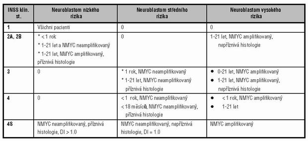 Terapeutické skupiny onemocnění podle klinických a biologických vlastností neuroblastomu dle INSS