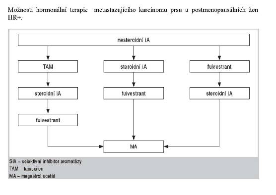 U HER-2 dependentních nádorů je standardem kombinace trastuzumabu a monochemoterapie taxany. Je otázkou, jaký bude optimální léčebný postup u nemocných léčených adjuvantně antracykliny, taxany a trastuzumabem. Především u HER-2 independentních karcinomů je novou možností zařazení bevacizumabu. Při neexistenci molekulární predikce je otázkou u kterých nemocných? U nemocných s hormonálně dependentním, pomalu progredujícím metastazujícím karcinomem prsu je u postmenopauzálních doporučeno volit hormonální léčbu jako první léčebnou modalitu. Selektivní inhibitory aromatáz jsou léky první volby. Fulvestrant je pak další lékem rozšiřujícím paletu hormonální léčby. Je otázkou, jaký je optimální léčebný postup u nemocných léčených adjuvantně selektivními inhibitory aromatáz samostatně nebo sekvenčně.