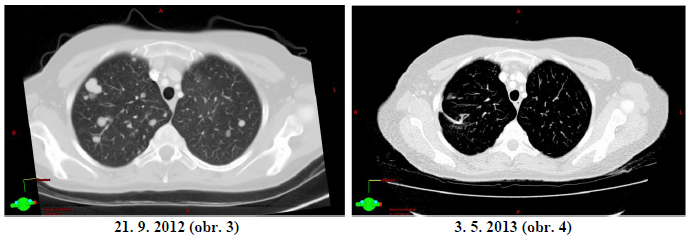 JH r. 1972, dg. 2010 ca mammae l.dx T2 N0 M0, pT2 pN0 pM0, histol.: invazivní duktální karcinom M8500/32, ER 60%, PR70%, Ki67 5%, HER2neu 1+, FISH nebyla nalezena amplifikace, prokázaná mutace BRCA2. Adjuvantní léčba byla ukončena 5/2011. 1. generalizace dle CT 21. 9. 2012 – mnohočetná meta ložiska do obou plicních křídel, největší do 22mm, (Obr. 3)
